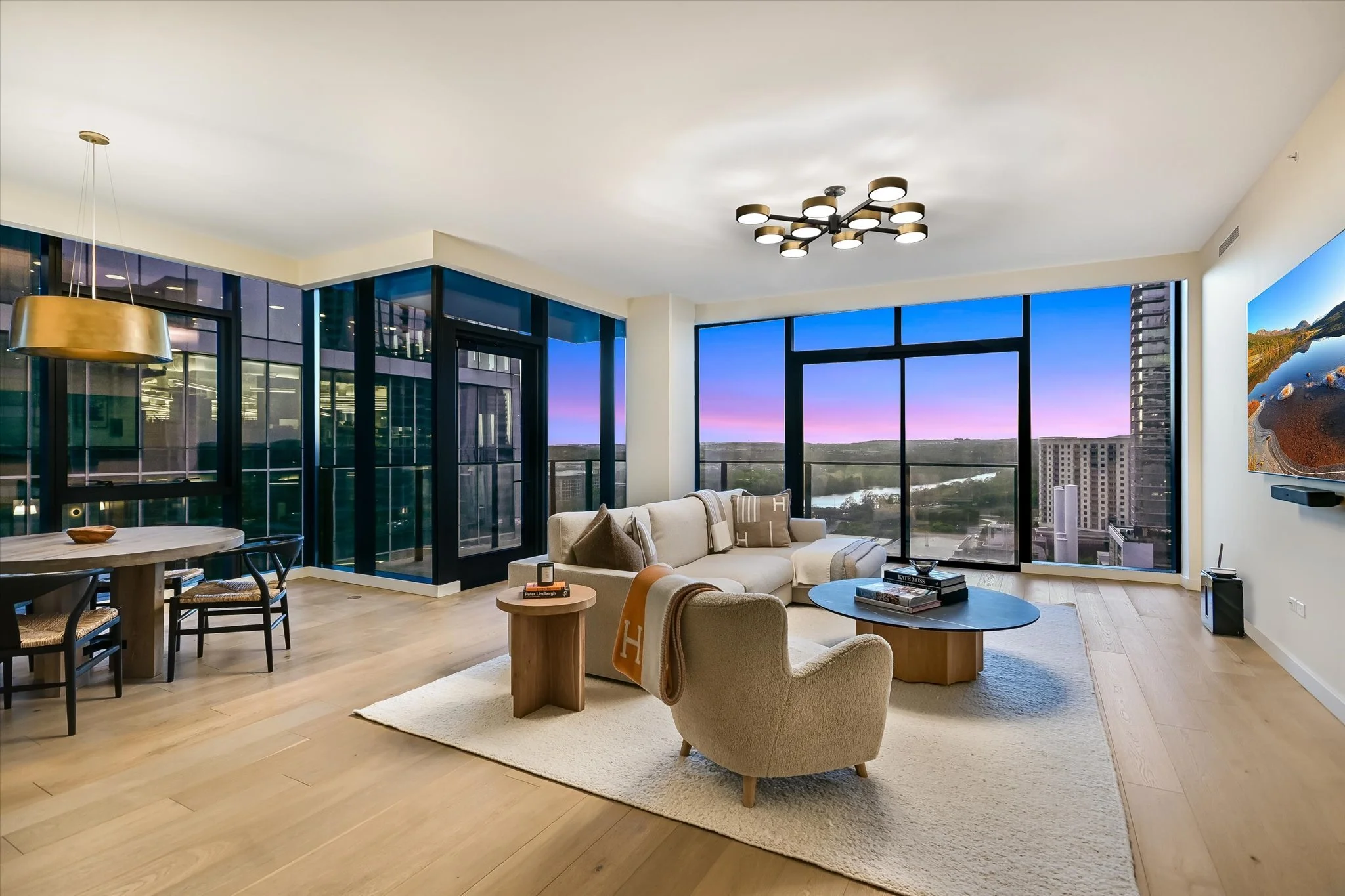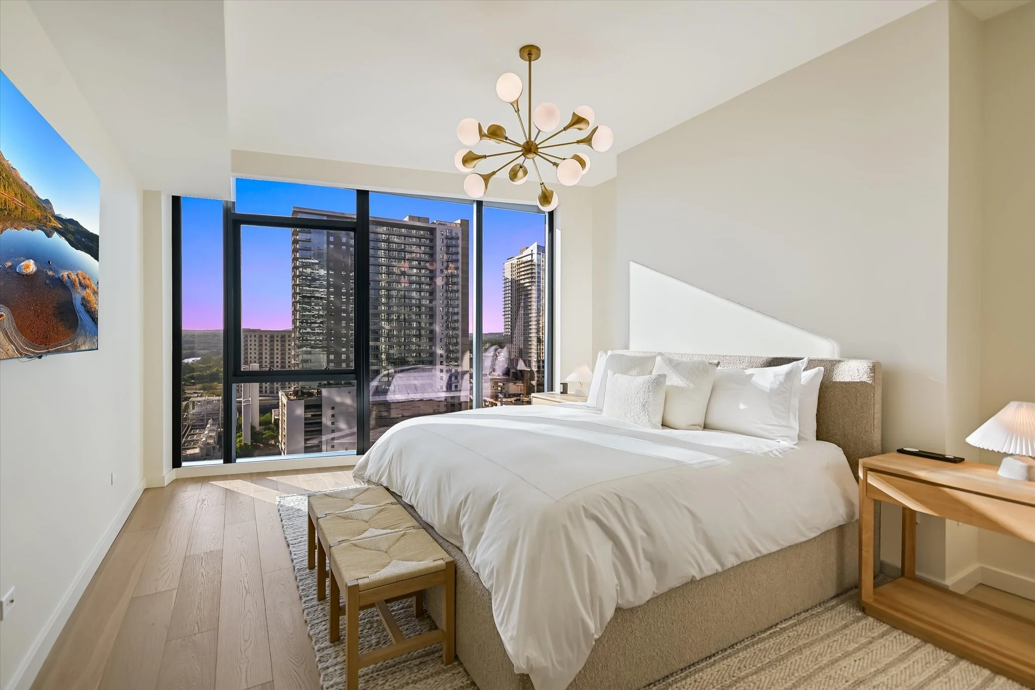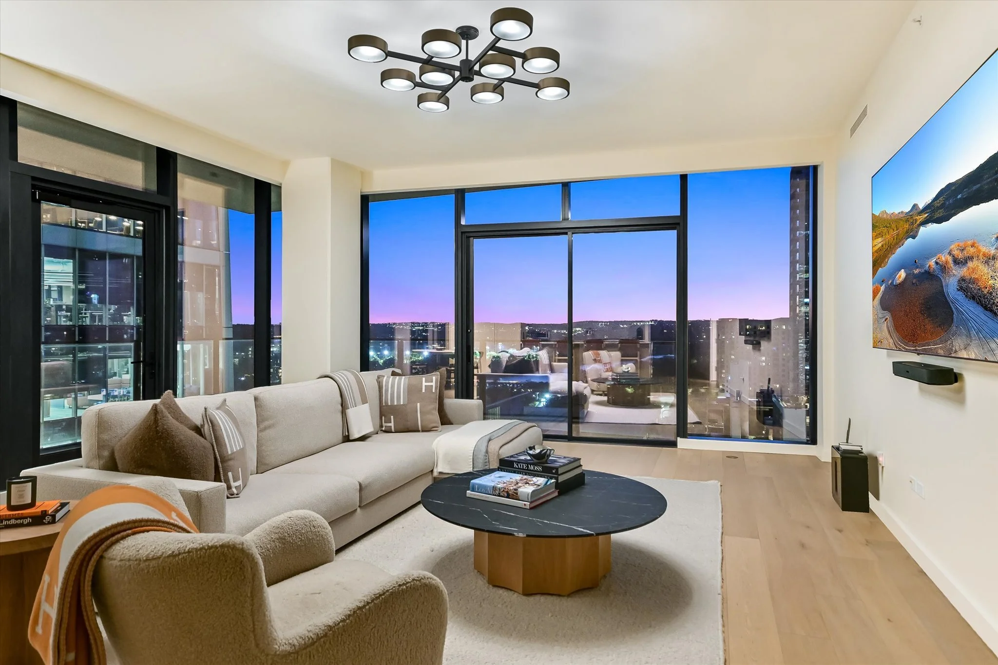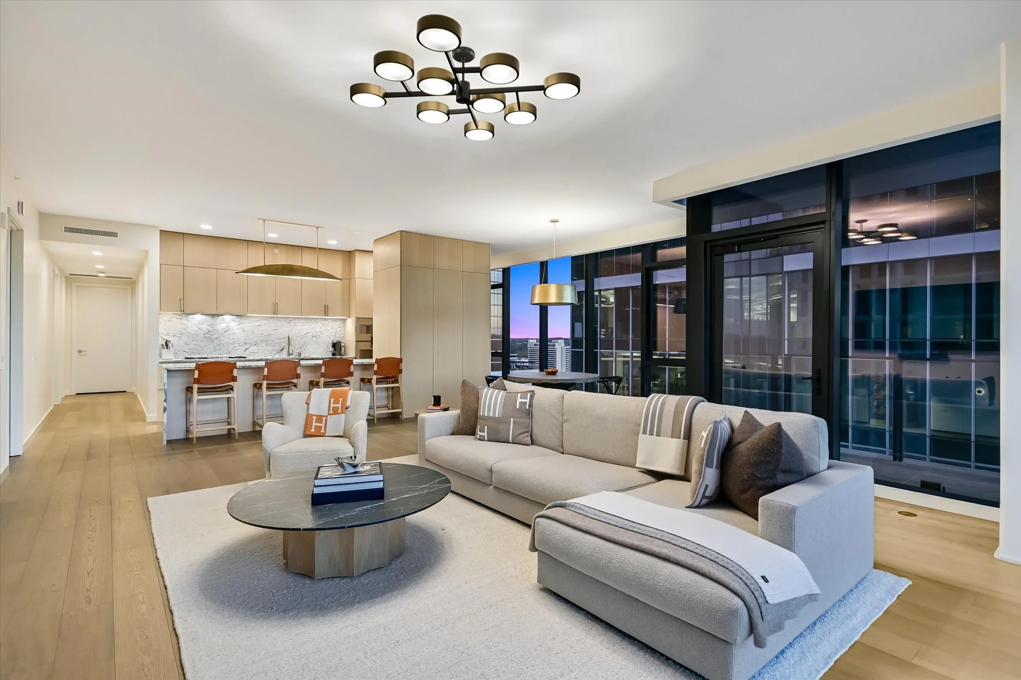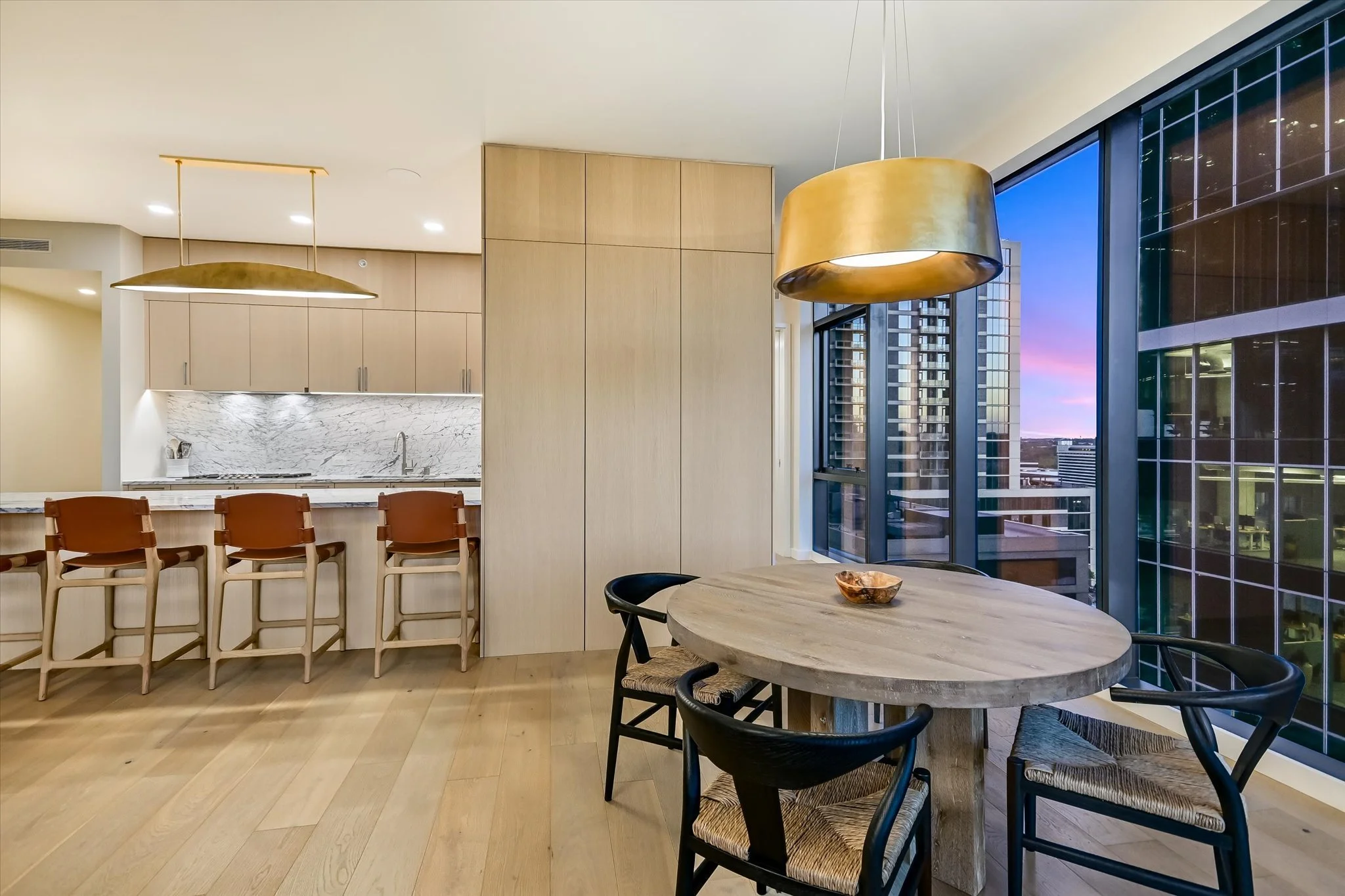 The coveted unit has both a southwest-facing corner balcony and the most desirable floor plan. Imagine greeting the morning with a cup of coffee while looking out over the lake shimmering in the sunrise. Or celebrating the end of the workday by watching the sun set over the hills as the lights wink on in the surrounding buildings, perhaps ordering a bite from one of the hotel’s exceptional restaurants if cooking isn’t in the cards. The view isn’t lost inside, with floor-to-ceiling windows wrapping the unit and offering the same striking water and sunset views. Complementing the glorious vista, the residence is designed with sleek yet warm materials. From white-oak floors to creamy Statuario marble and handmade Japanese tiles, every element combines to create a subtle, elegant whole. Lighting and kitchen selections by Kelly Wearstler add to the sophistication.