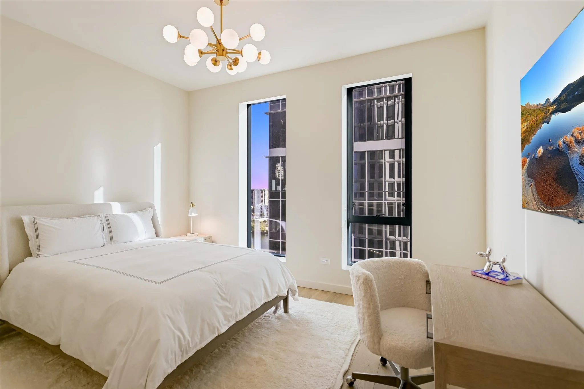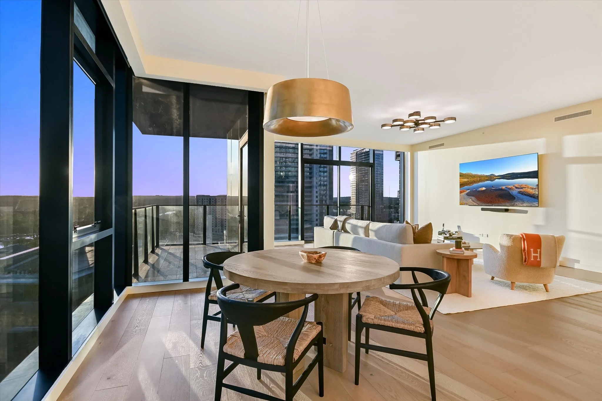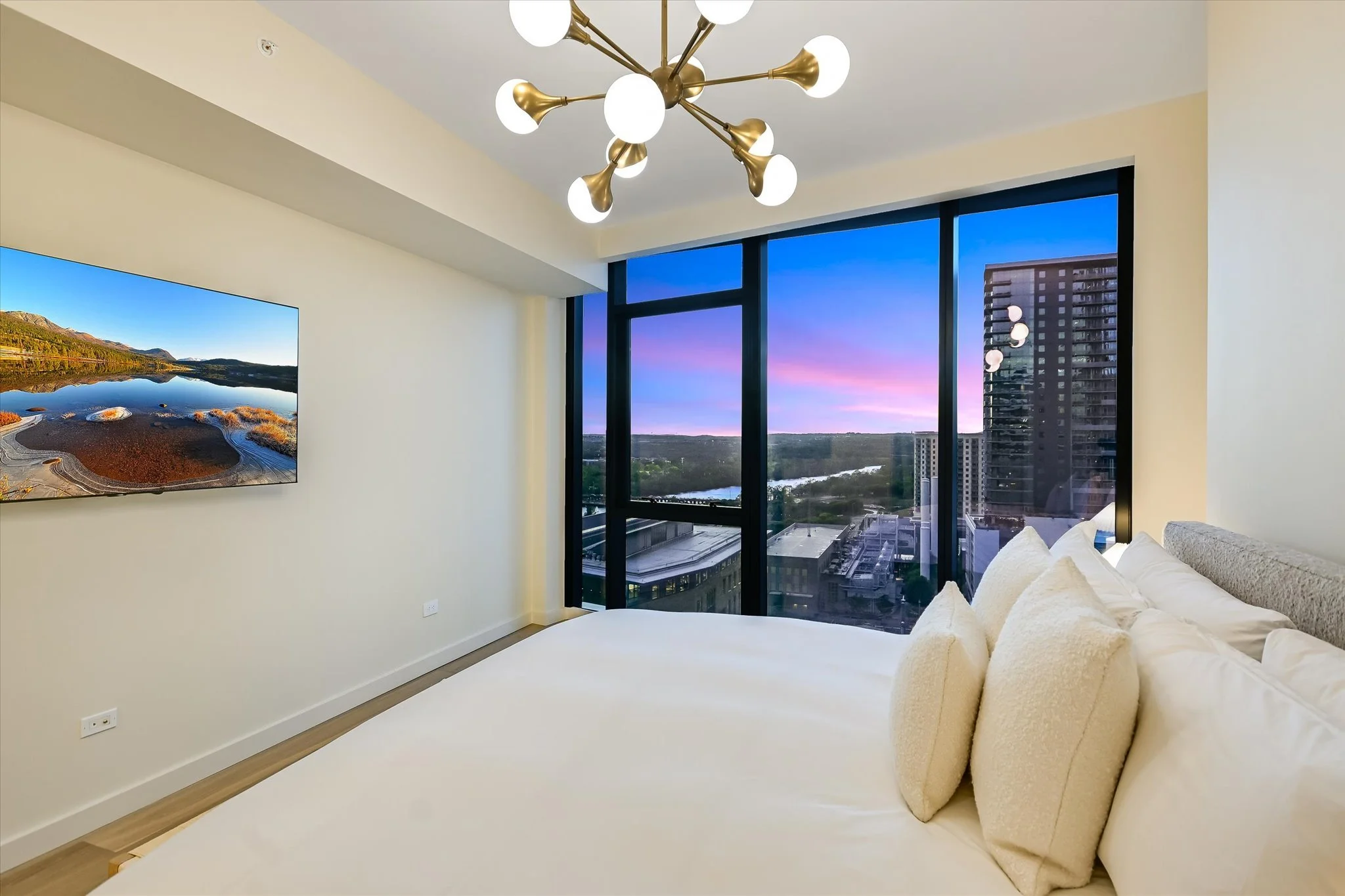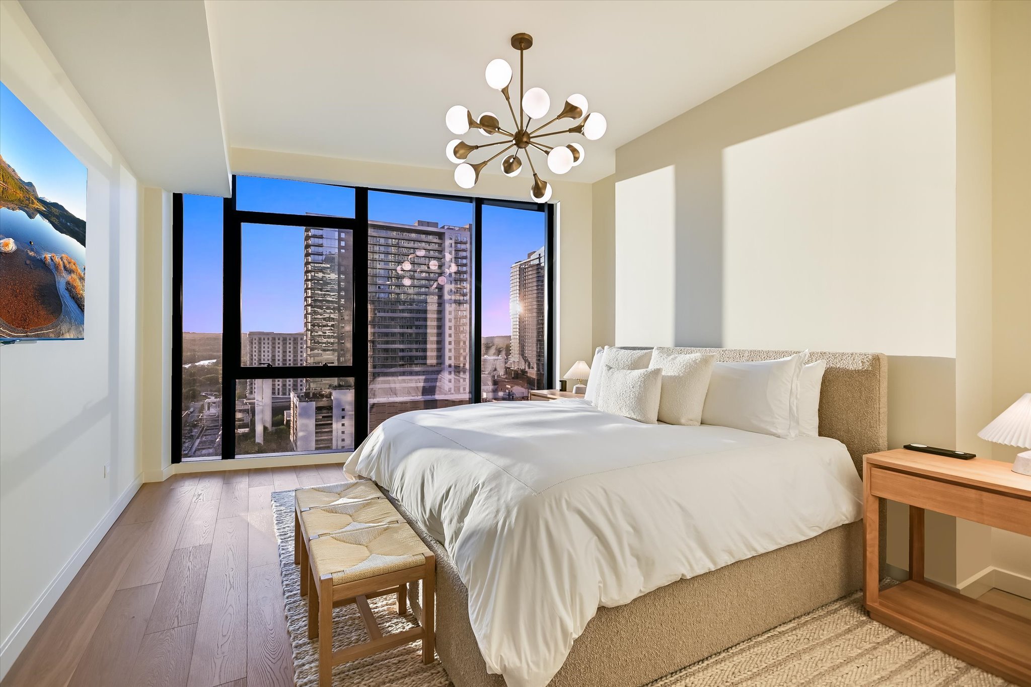 The coveted unit has both a southwest-facing corner balcony and the most desirable floor plan. Imagine greeting the morning with a cup of coffee while looking out over the lake shimmering in the sunrise. Or celebrating the end of the workday by watching the sun set over the hills as the lights wink on in the surrounding buildings, perhaps ordering a bite from one of the hotel’s exceptional restaurants if cooking isn’t in the cards. The view isn’t lost inside, with floor-to-ceiling windows wrapping the unit and offering the same striking water and sunset views. Complementing the glorious vista, the residence is designed with sleek yet warm materials. From white-oak floors to creamy Statuario marble and handmade Japanese tiles, every element combines to create a subtle, elegant whole. Lighting and kitchen selections by Kelly Wearstler add to the sophistication.