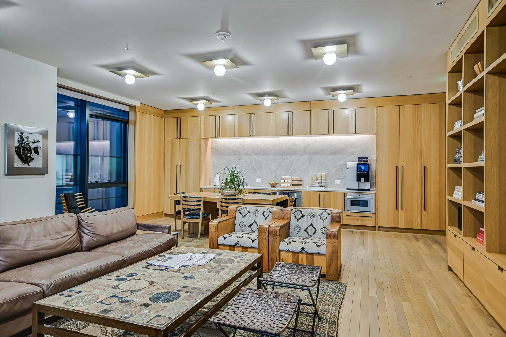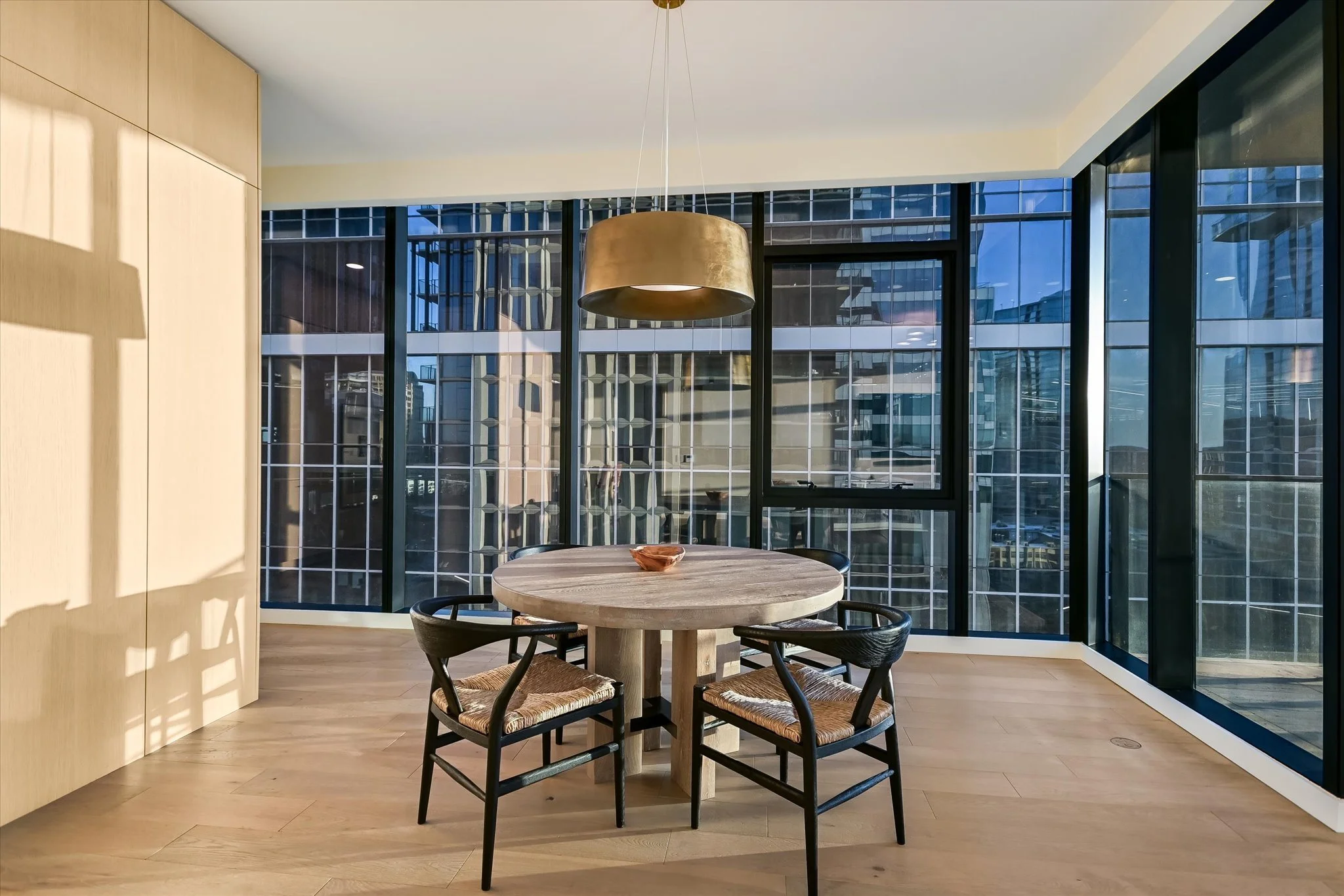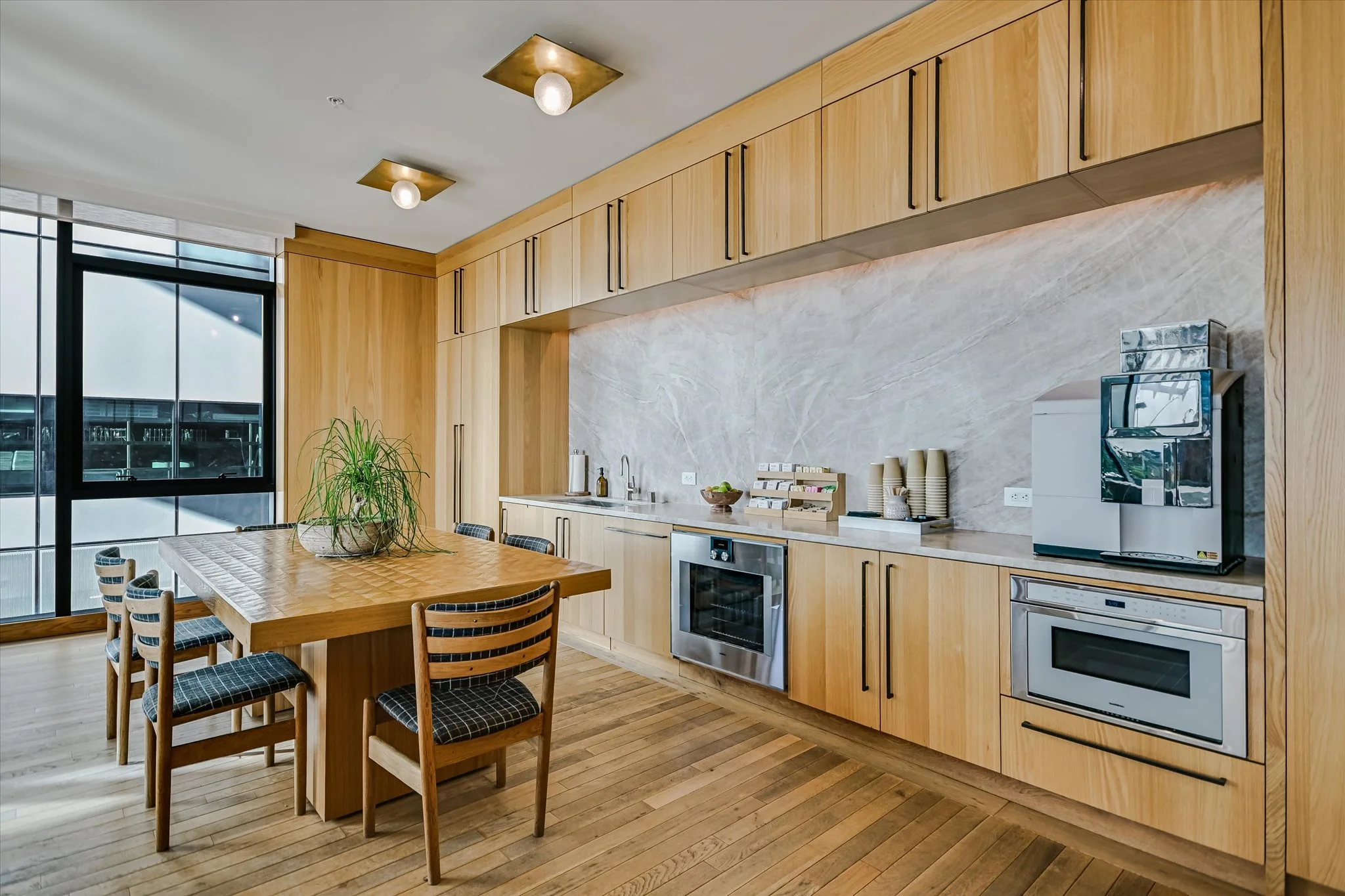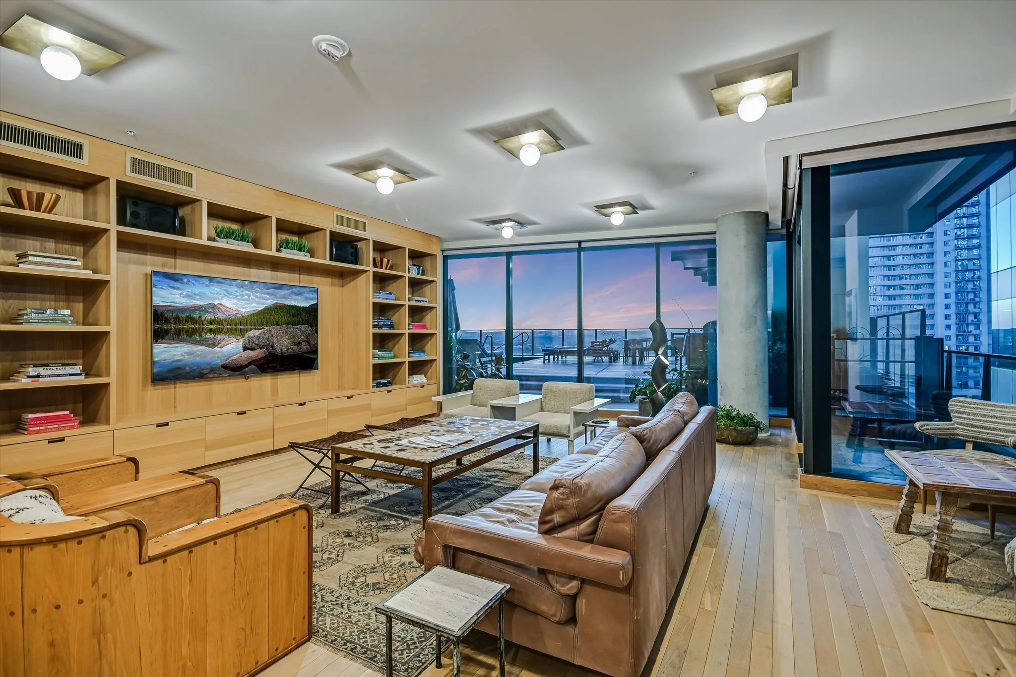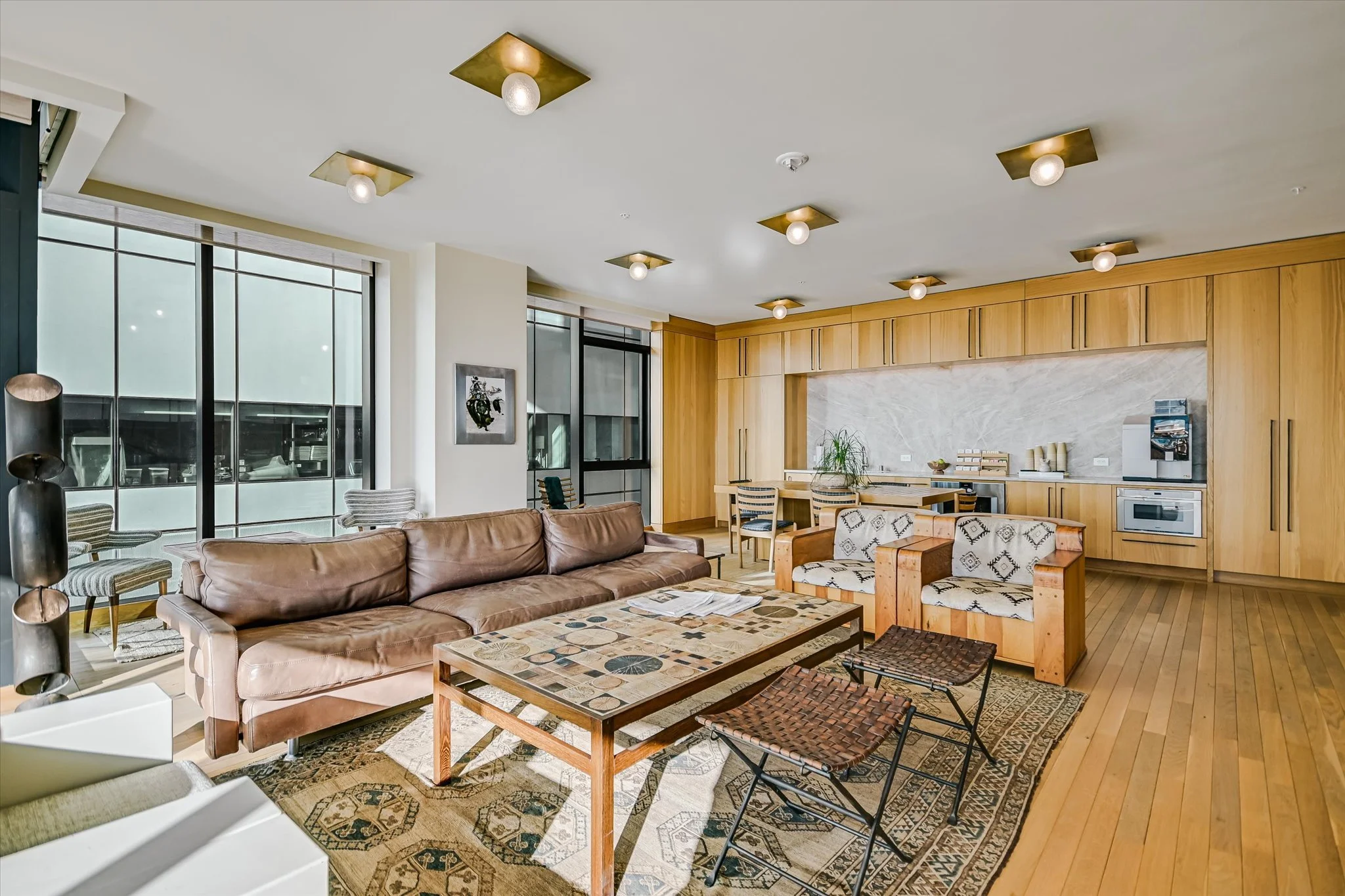 The coveted unit has both a southwest-facing corner balcony and the most desirable floor plan. Imagine greeting the morning with a cup of coffee while looking out over the lake shimmering in the sunrise. Or celebrating the end of the workday by watching the sun set over the hills as the lights wink on in the surrounding buildings, perhaps ordering a bite from one of the hotel’s exceptional restaurants if cooking isn’t in the cards. The view isn’t lost inside, with floor-to-ceiling windows wrapping the unit and offering the same striking water and sunset views. Complementing the glorious vista, the residence is designed with sleek yet warm materials. From white-oak floors to creamy Statuario marble and handmade Japanese tiles, every element combines to create a subtle, elegant whole. Lighting and kitchen selections by Kelly Wearstler add to the sophistication.