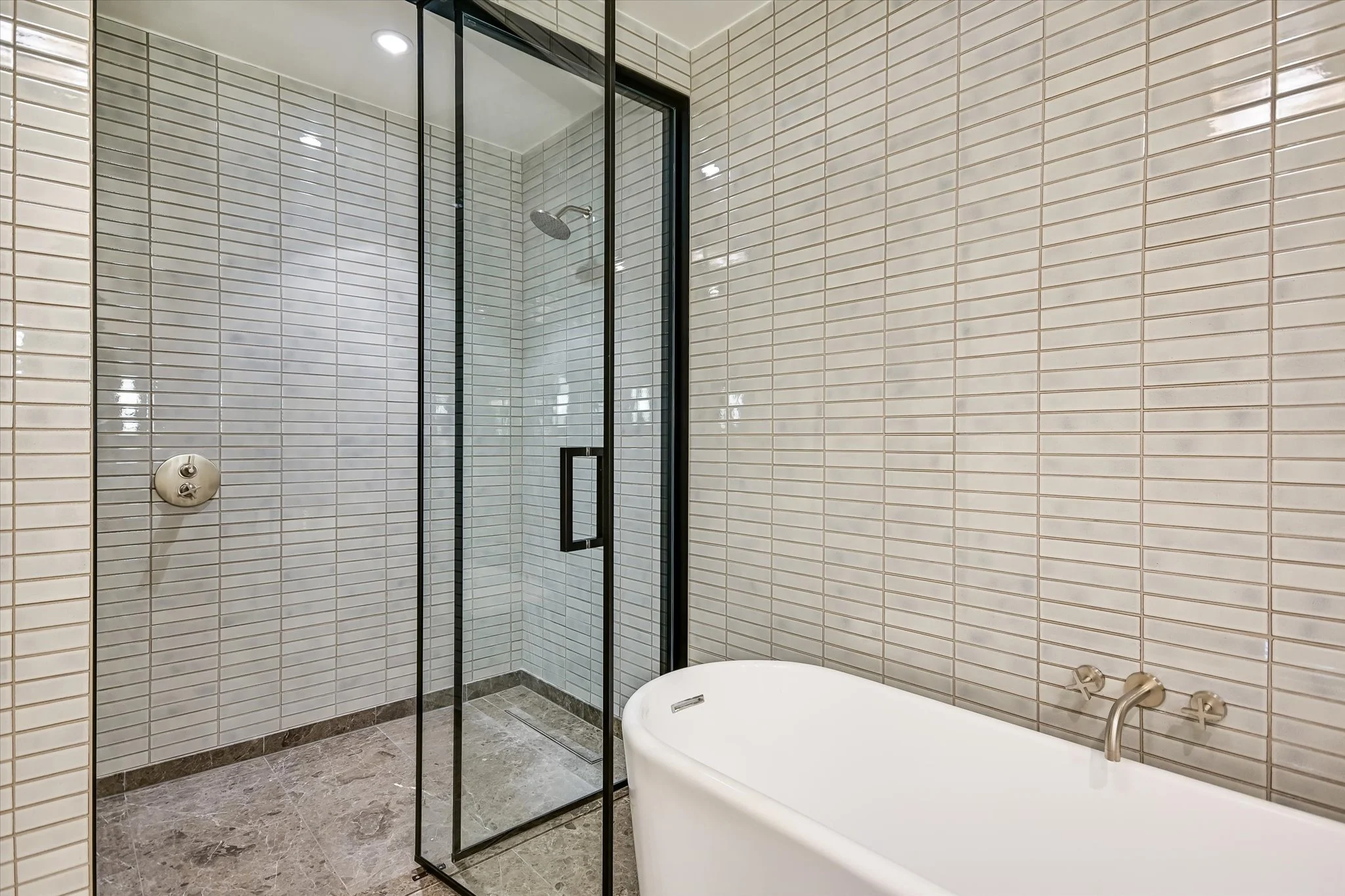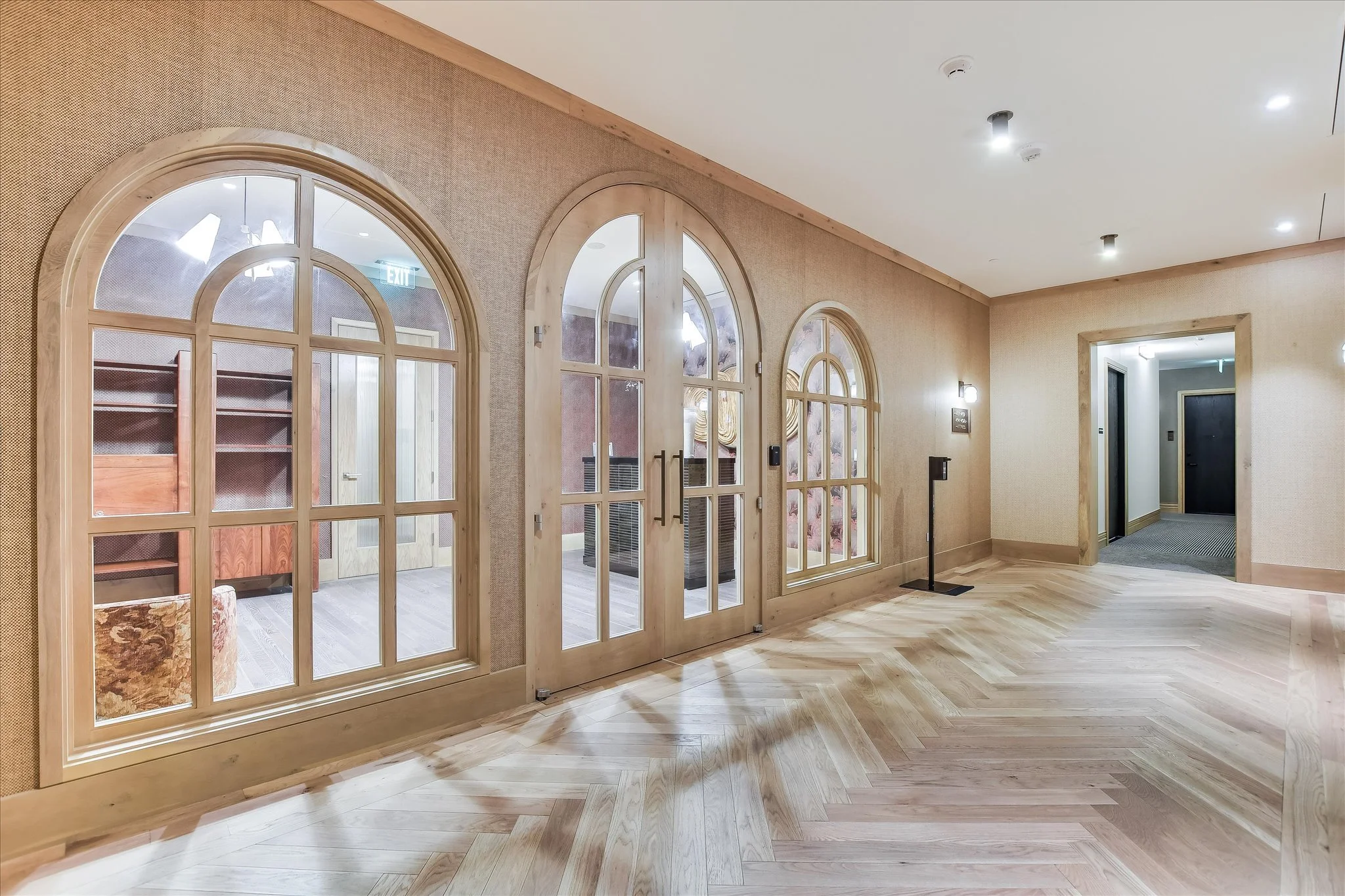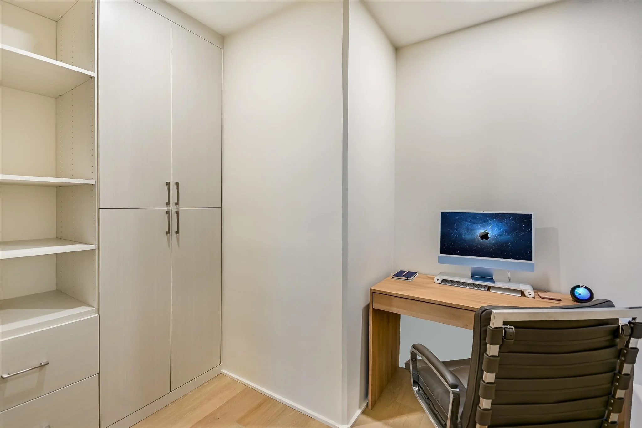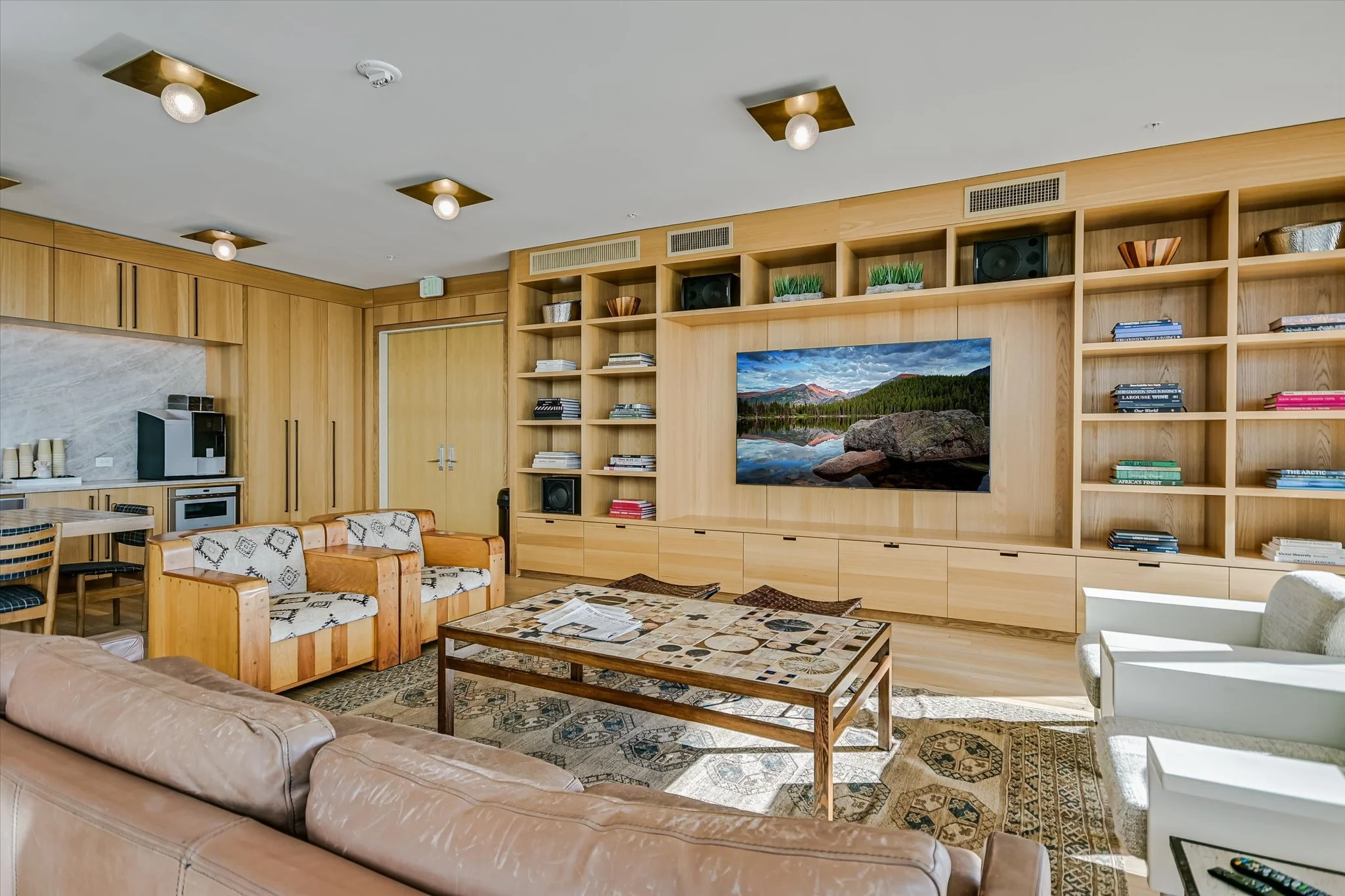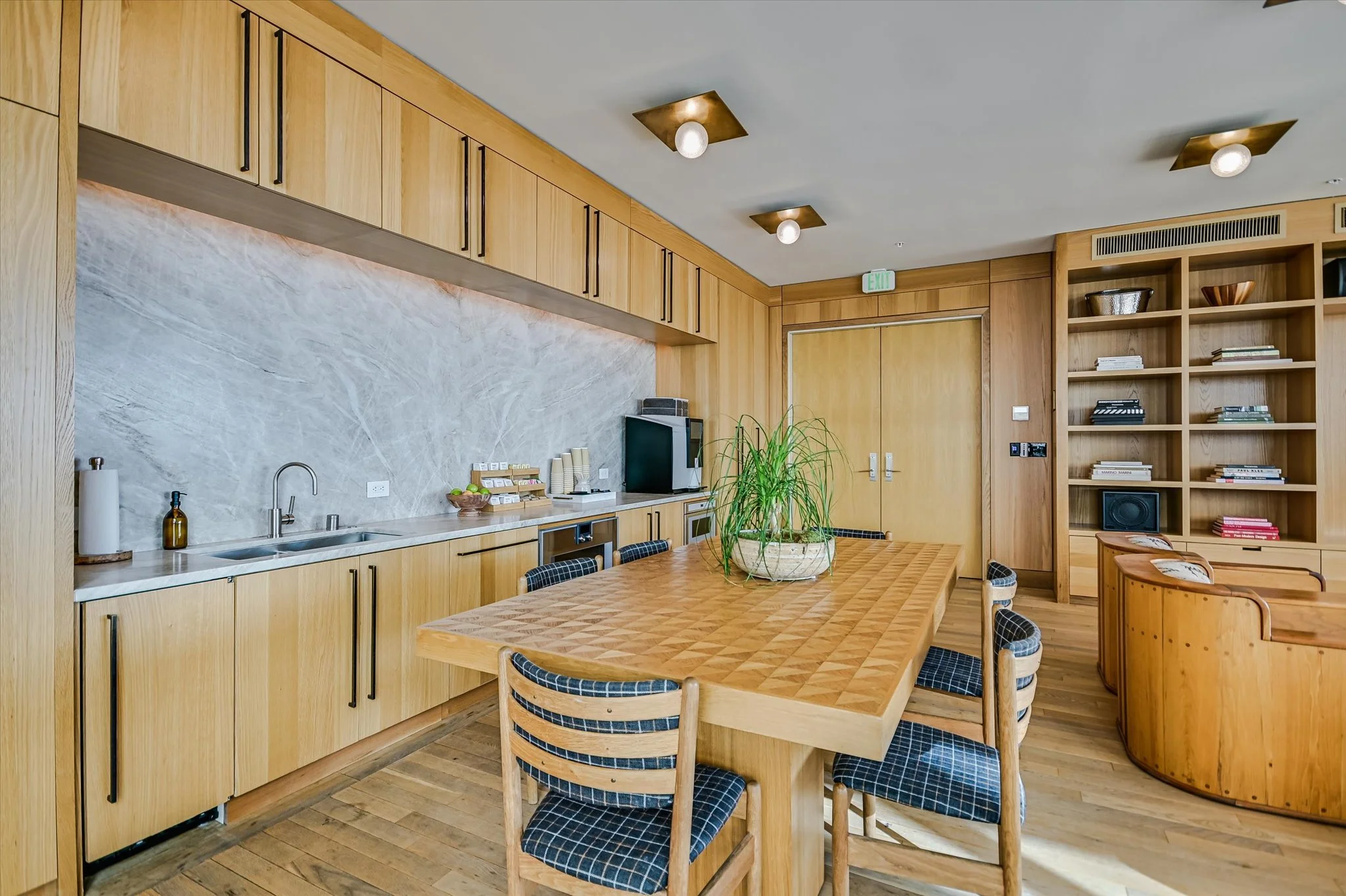 The coveted unit has both a southwest-facing corner balcony and the most desirable floor plan. Imagine greeting the morning with a cup of coffee while looking out over the lake shimmering in the sunrise. Or celebrating the end of the workday by watching the sun set over the hills as the lights wink on in the surrounding buildings, perhaps ordering a bite from one of the hotel’s exceptional restaurants if cooking isn’t in the cards. The view isn’t lost inside, with floor-to-ceiling windows wrapping the unit and offering the same striking water and sunset views. Complementing the glorious vista, the residence is designed with sleek yet warm materials. From white-oak floors to creamy Statuario marble and handmade Japanese tiles, every element combines to create a subtle, elegant whole. Lighting and kitchen selections by Kelly Wearstler add to the sophistication.