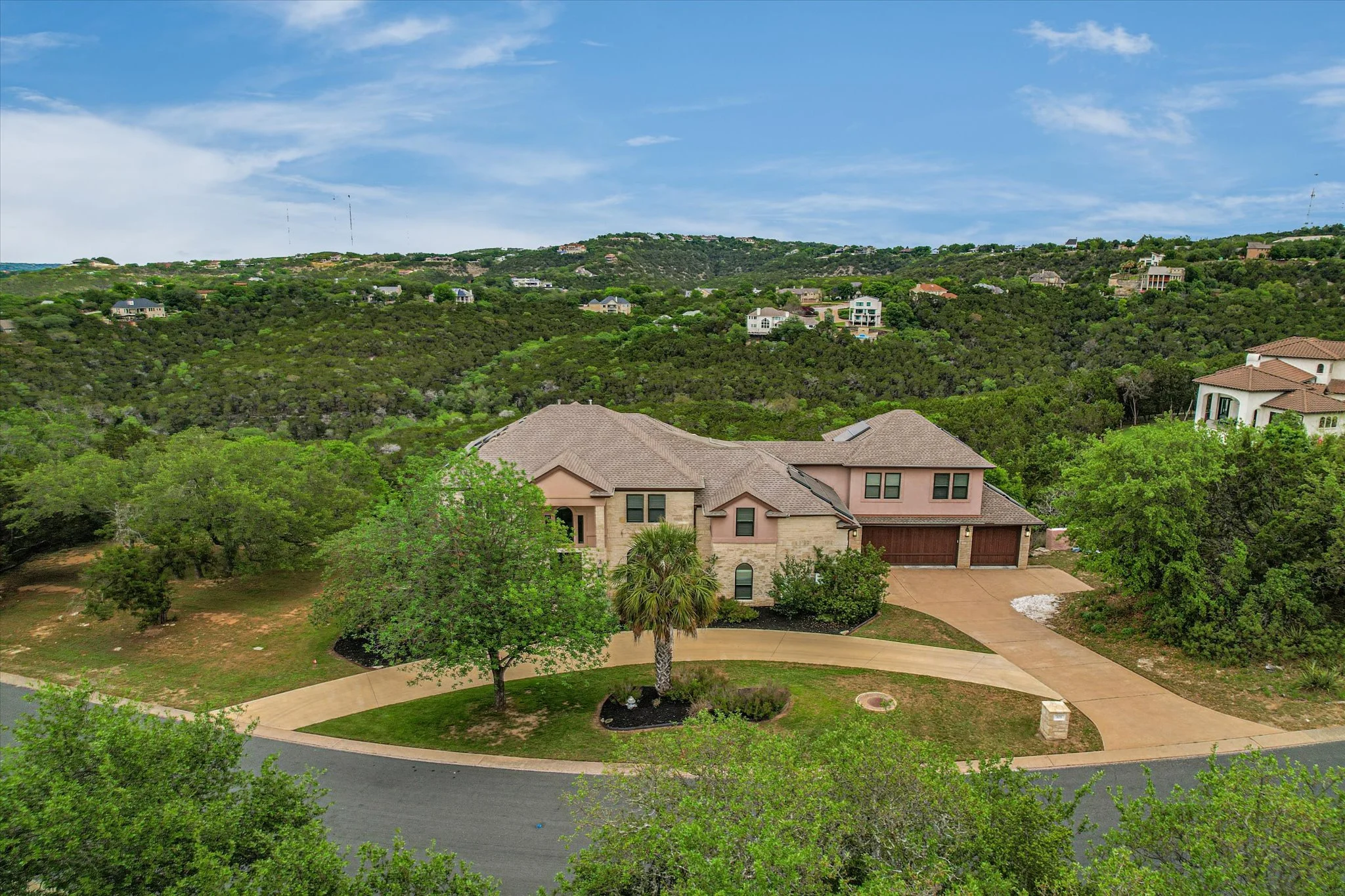 Gorgeous Rob Roy on the Lake estate home with verdant Hill Country views. Sited atop a lush canyon, this home looks out over rolling hills through picture windows that line the entire back of the home. From the moment you enter, you’ll be drawn through to the Trex deck cantilevered over the valley. Sip a cocktail at sunset, listening to the birds chirp and wildlife rustle below, enjoying the ultimate relaxation. Complementing the park-like setting, the front of the property is dotted with large trees and a stately palm, which frames the limestone and stucco home.